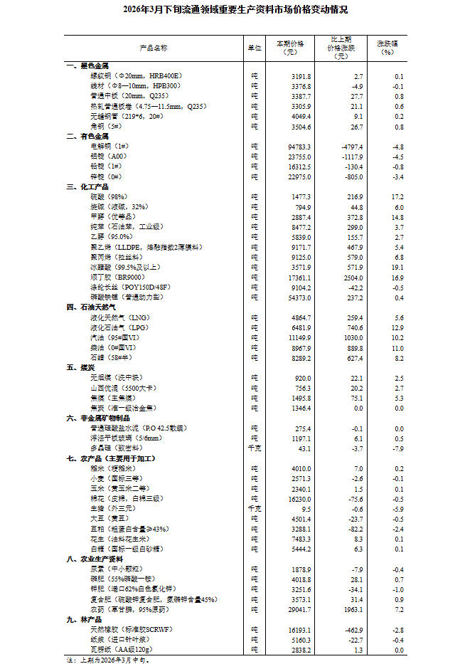 国家统计局:3月下旬流通领域重要生产资料31种产品价格上涨